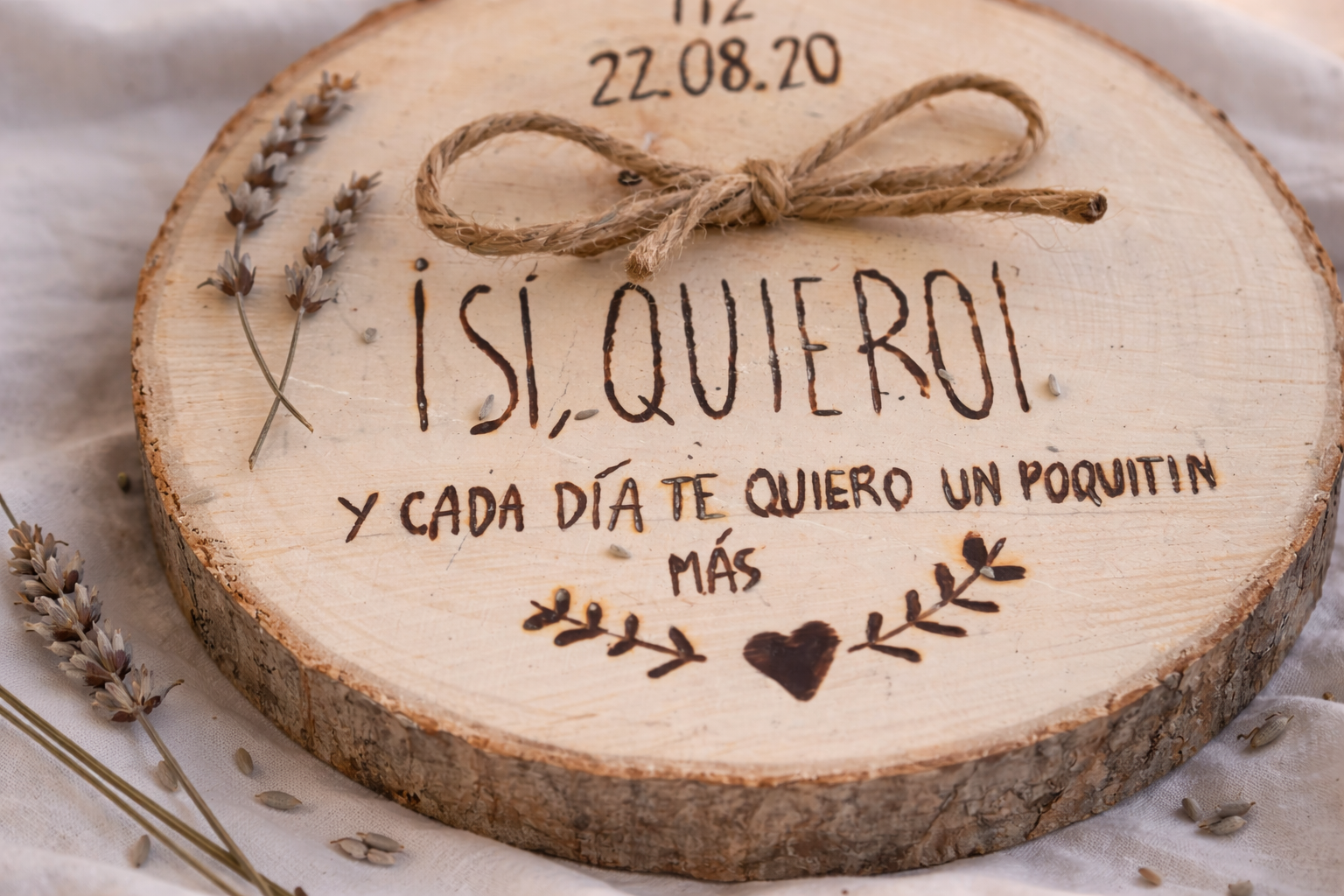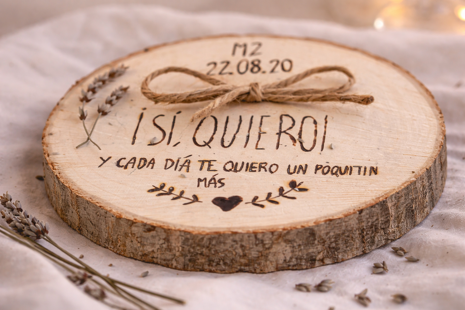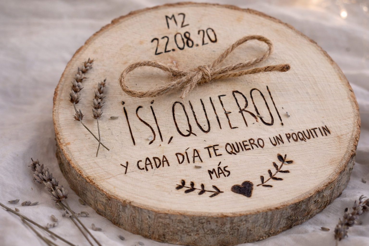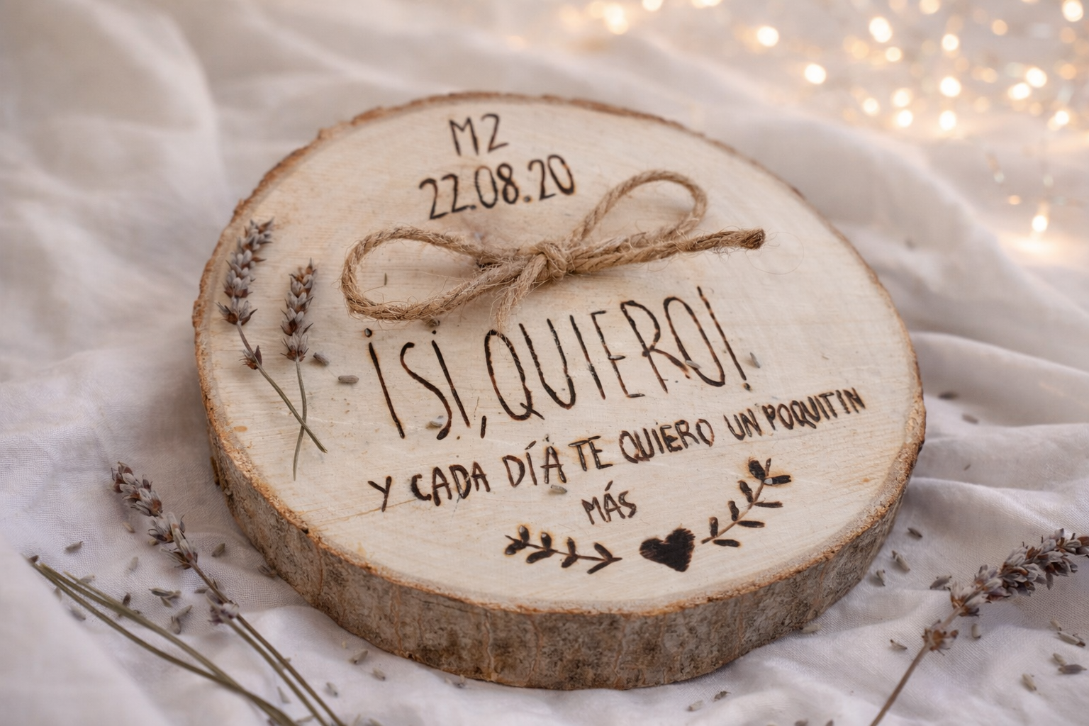 Nuestro porta alianzas está cuidadosamente elaborado con madera de chopo, elegida por su textura suave y su apariencia natural. Cada rodaja de madera ha sido meticulosamente seleccionada para asegurar su calidad excepcional, lo que garantiza que tengas una pieza duradera y atemporal que siempre evocará los recuerdos de tu gran día.